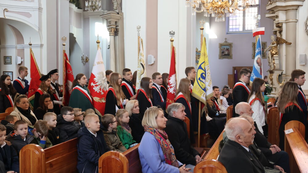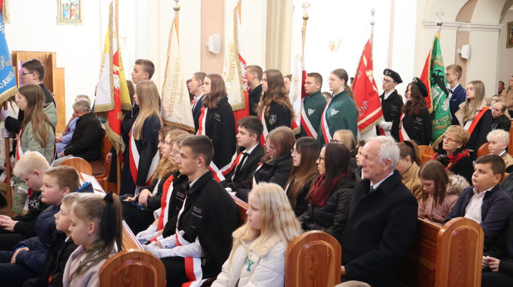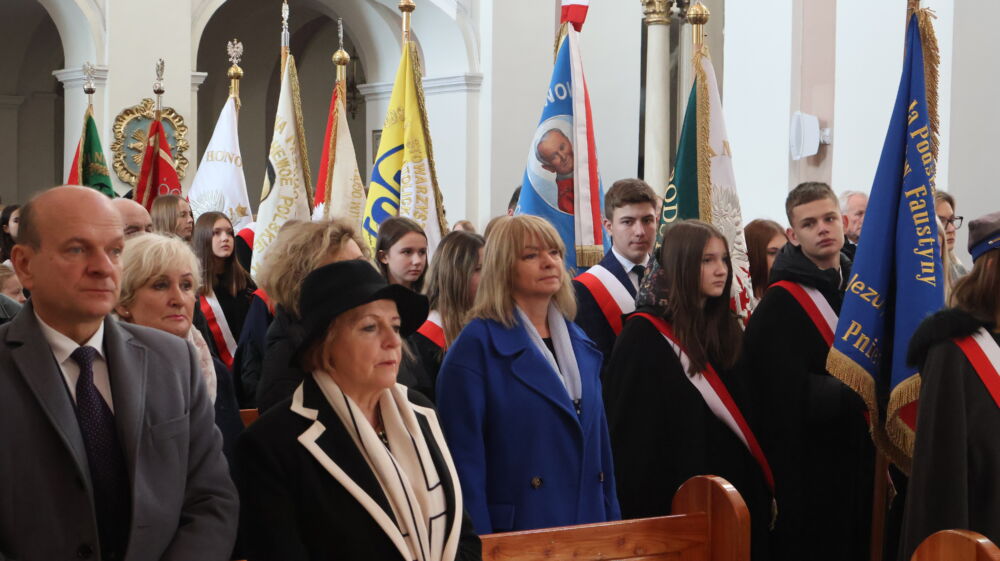We Mszy św. uczestniczyli oprócz społeczności szkoły także zaproszeni goście, poczty sztandarowe szkół SPSK i z gminy Kłodawa.