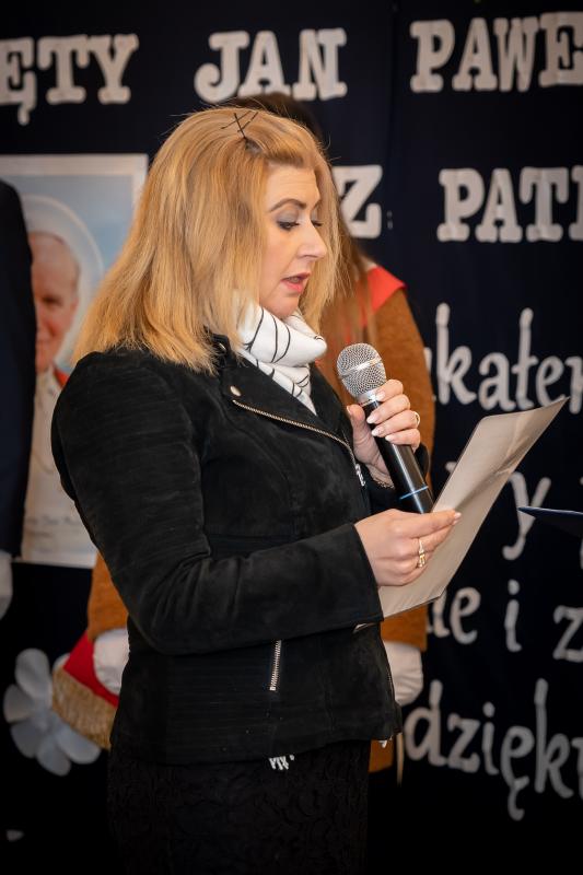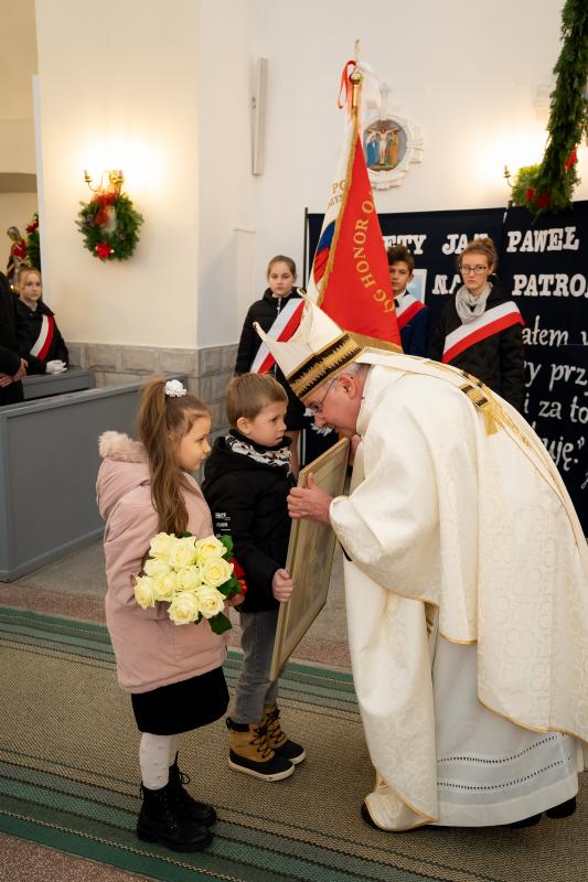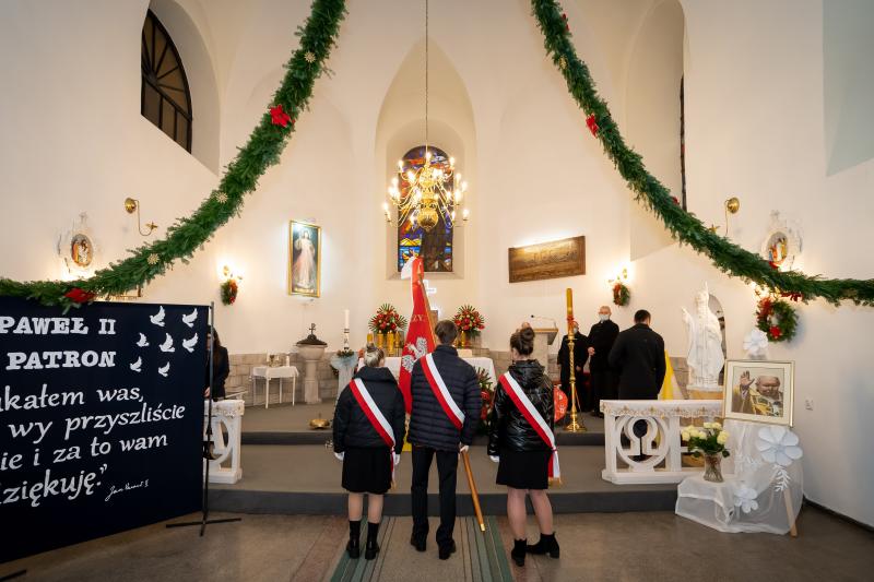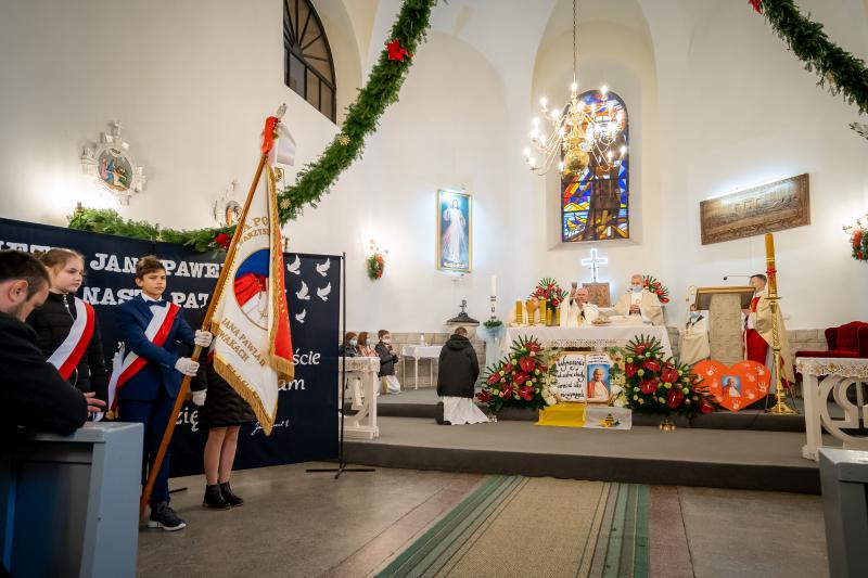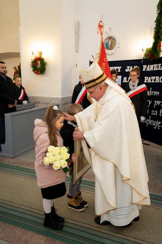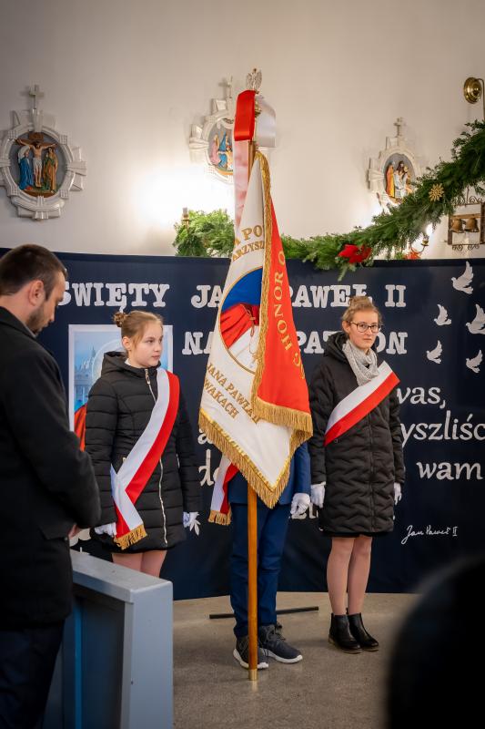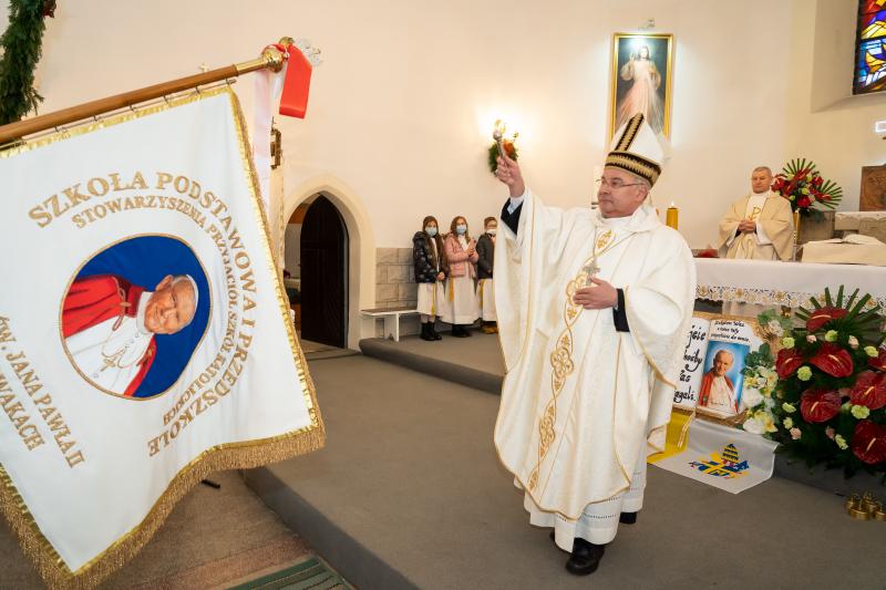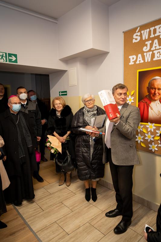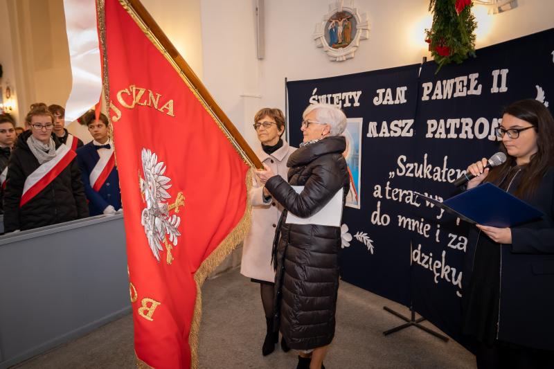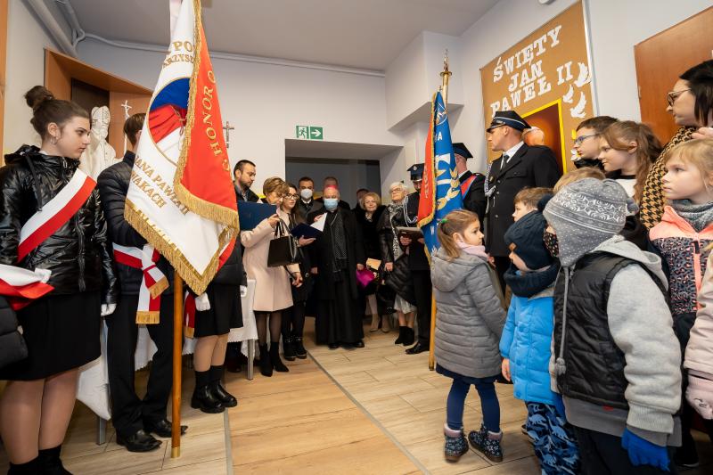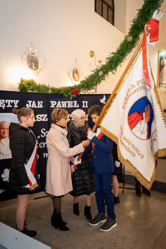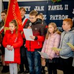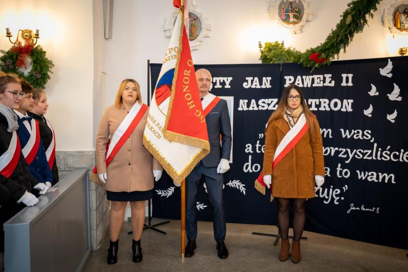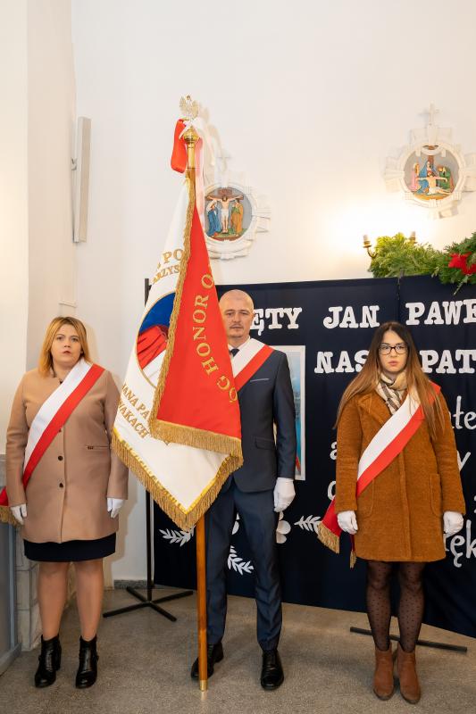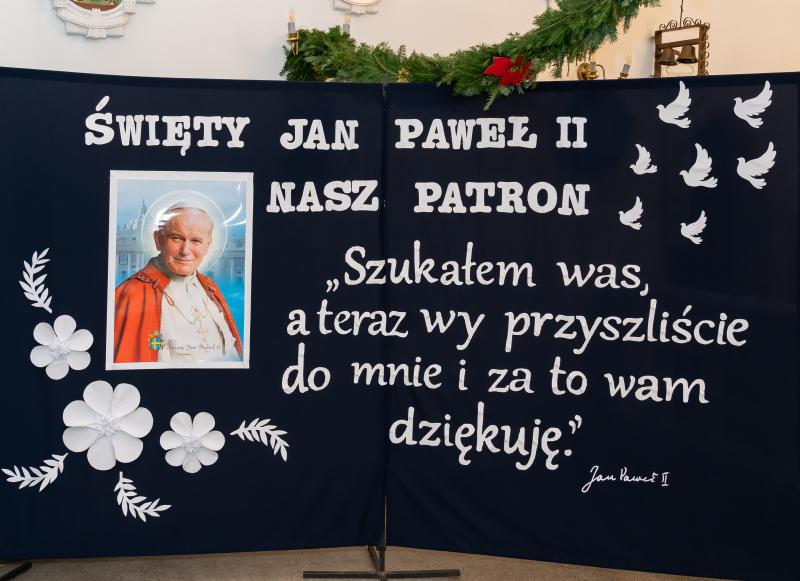 ks. Maciejem Skórą oraz ks. Proboszczem Ryszardem Krawieckim. Uroczysty akt nadania imienia wręczyła Pani Prezes SPSK, Maria Chodkiewicz. W uroczystości brali również udział zaproszeni goście, władze samorządowe, przyjaciele placówki, uczniowie, nauczyciele, pracownicy oraz rodzice. Motywem przewodnim całej uroczystości były słowa papieża: „Wymagajcie od siebie, choćby inni od Was nie wymagali”.