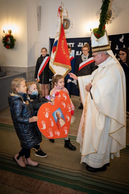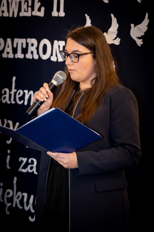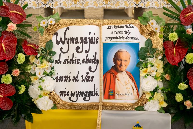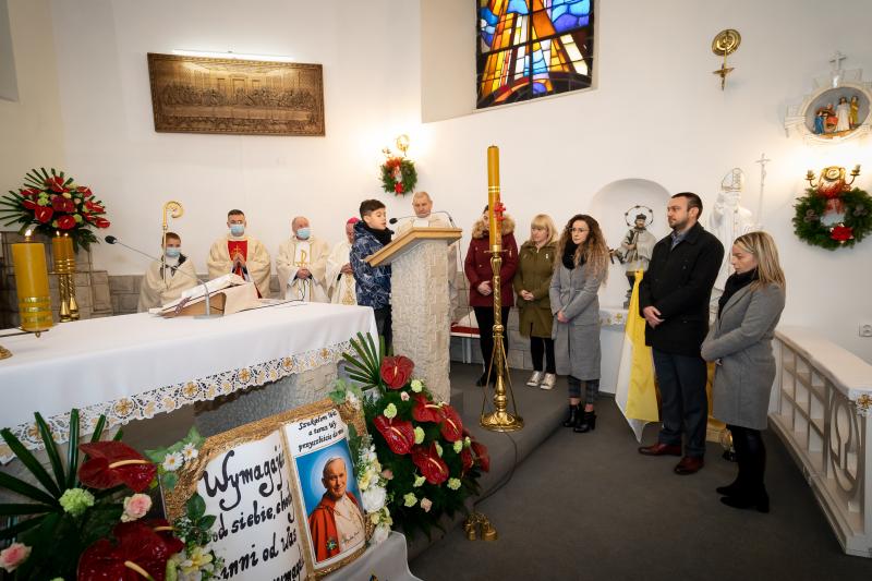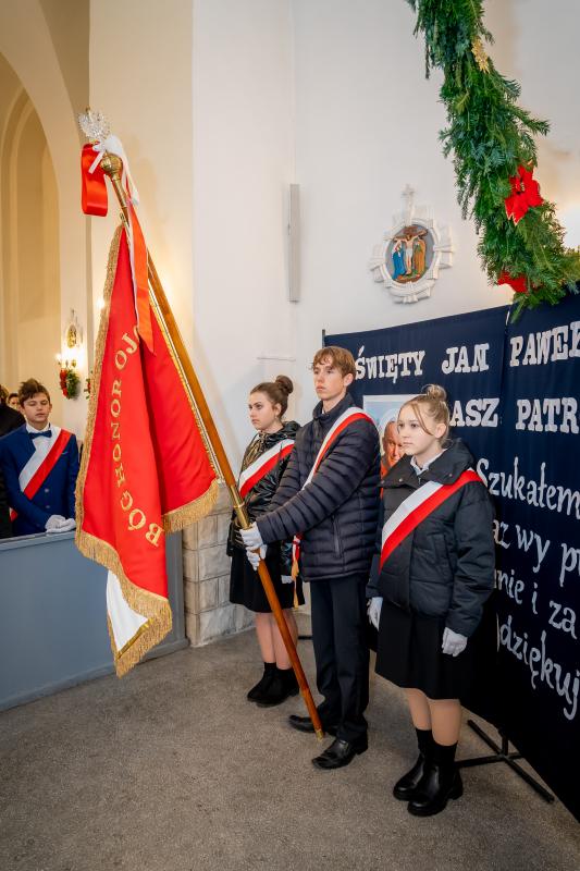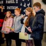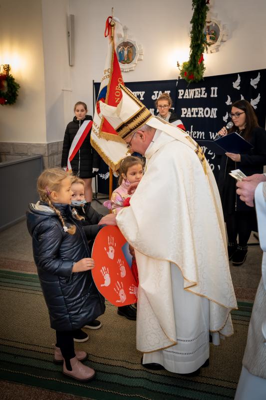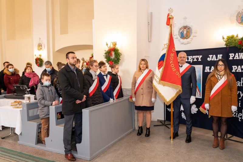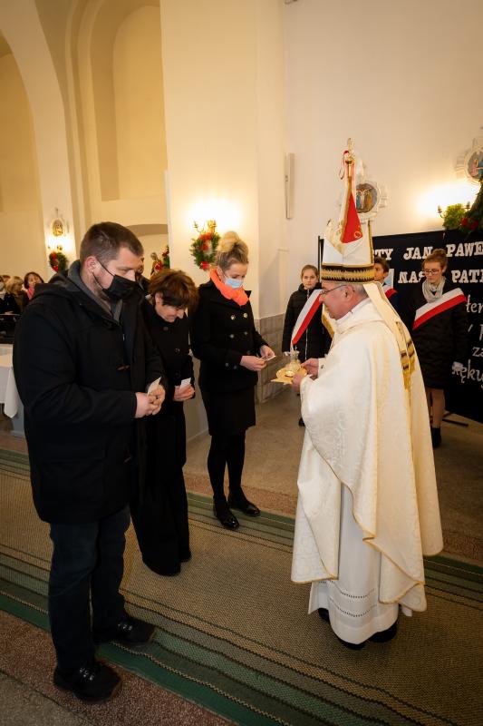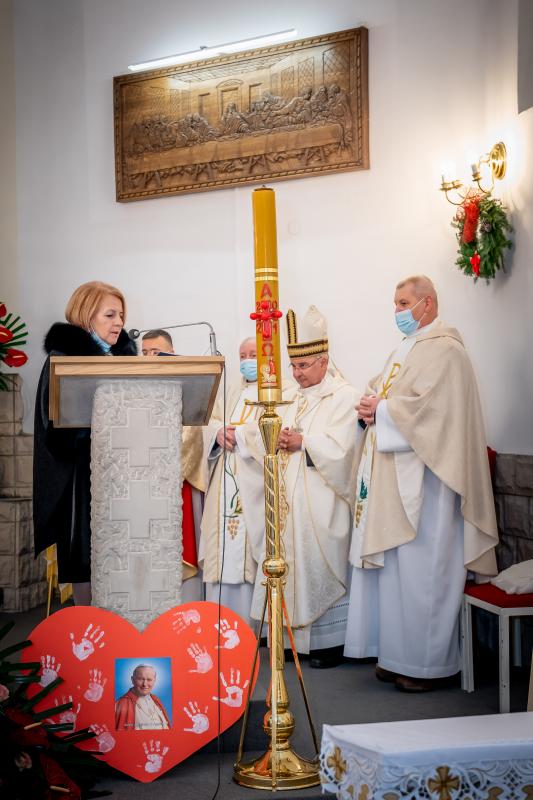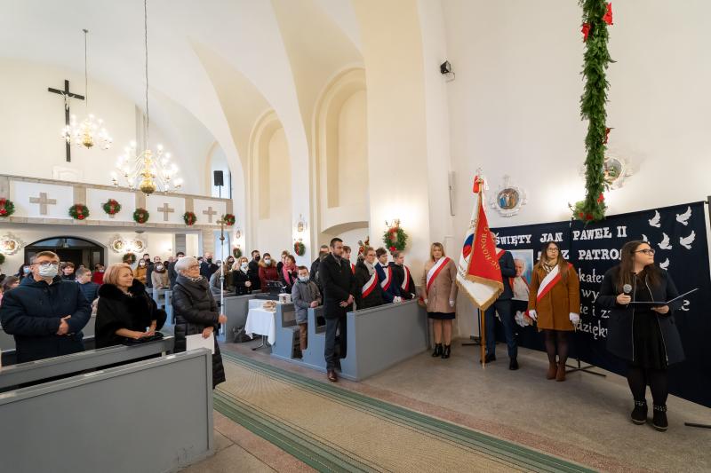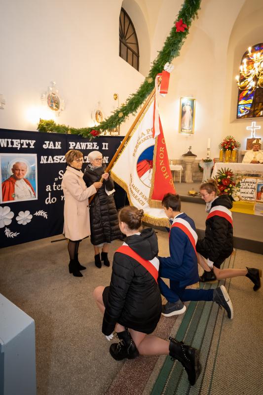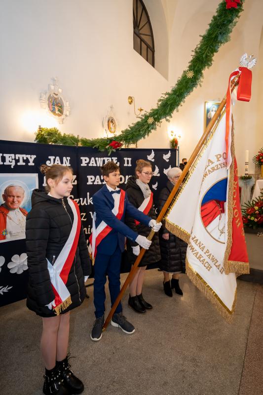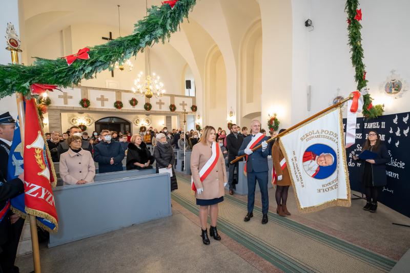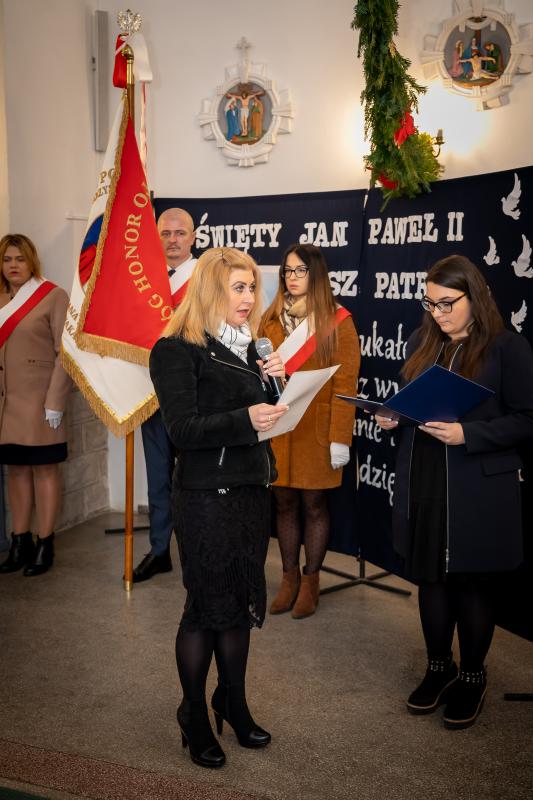 ks. Maciejem Skórą oraz ks. Proboszczem Ryszardem Krawieckim. Uroczysty akt nadania imienia wręczyła Pani Prezes SPSK, Maria Chodkiewicz. W uroczystości brali również udział zaproszeni goście, władze samorządowe, przyjaciele placówki, uczniowie, nauczyciele, pracownicy oraz rodzice. Motywem przewodnim całej uroczystości były słowa papieża: „Wymagajcie od siebie, choćby inni od Was nie wymagali”.