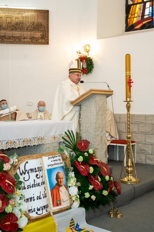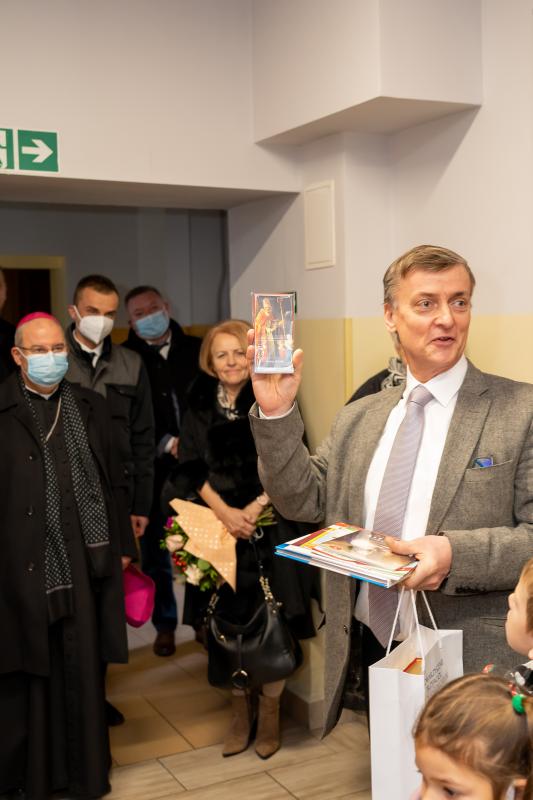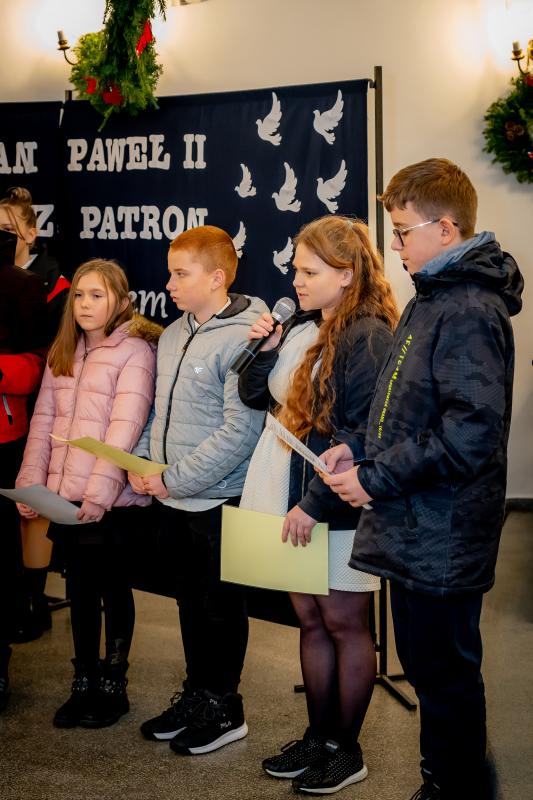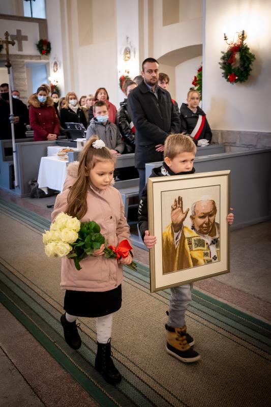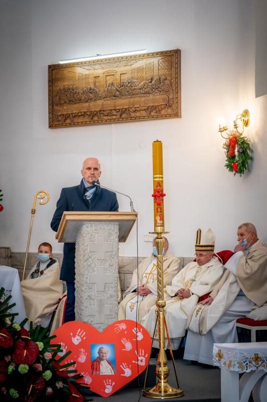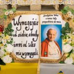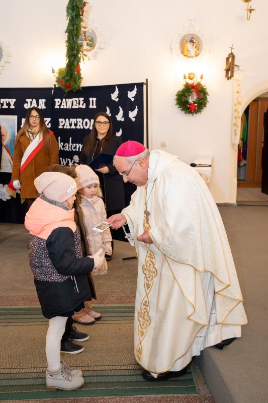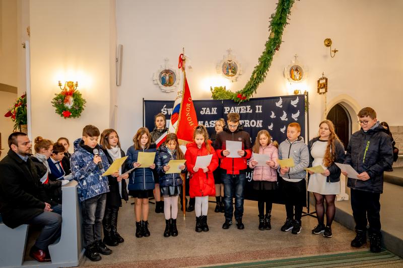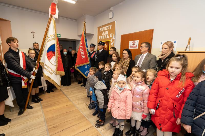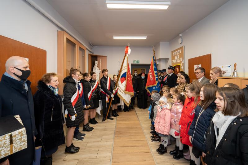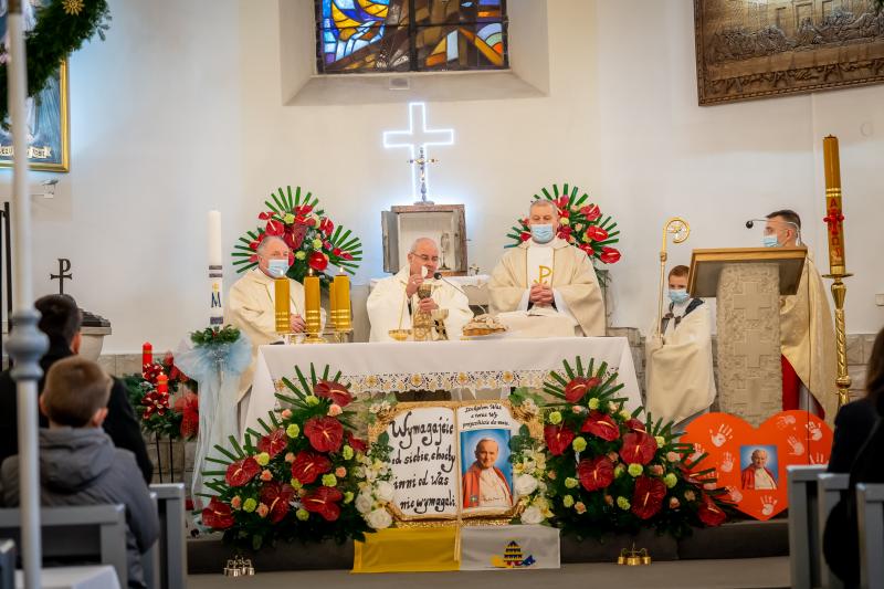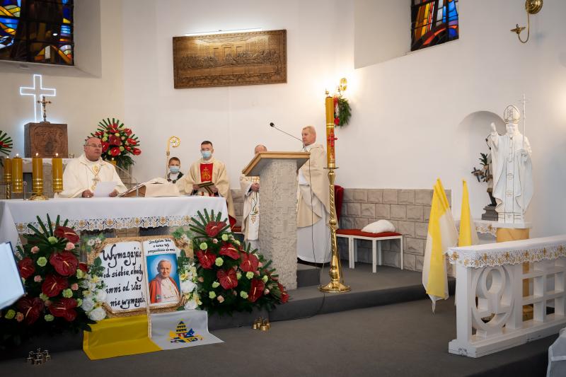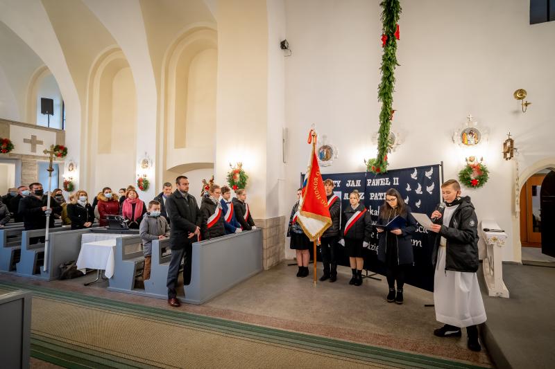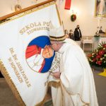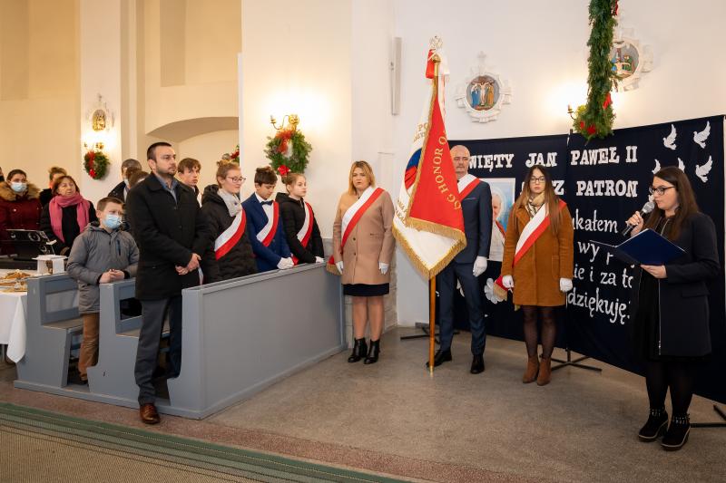 ks. Maciejem Skórą oraz ks. Proboszczem Ryszardem Krawieckim. Uroczysty akt nadania imienia wręczyła Pani Prezes SPSK, Maria Chodkiewicz. W uroczystości brali również udział zaproszeni goście, władze samorządowe, przyjaciele placówki, uczniowie, nauczyciele, pracownicy oraz rodzice. Motywem przewodnim całej uroczystości były słowa papieża: „Wymagajcie od siebie, choćby inni od Was nie wymagali”.