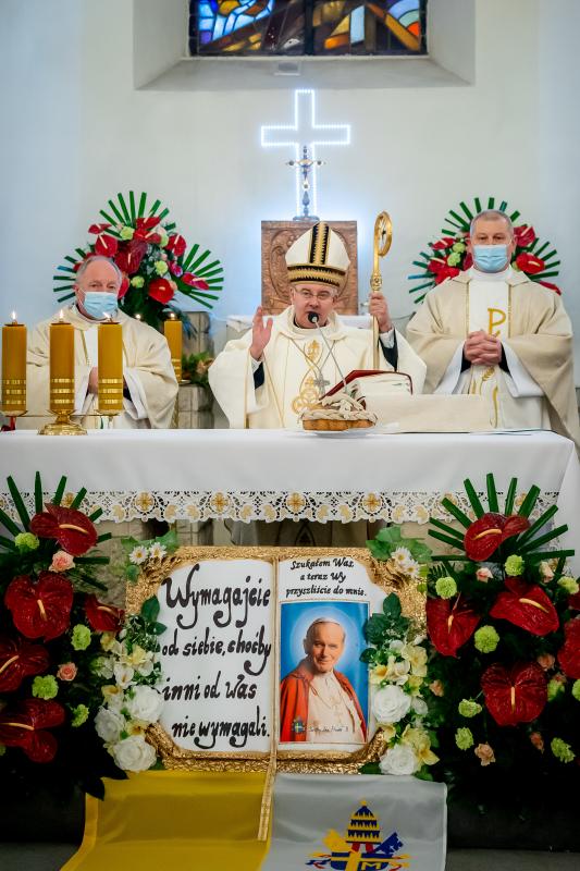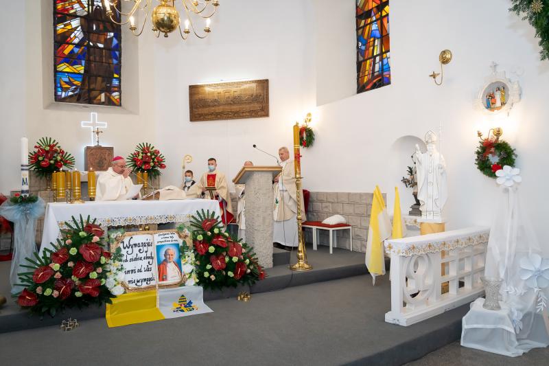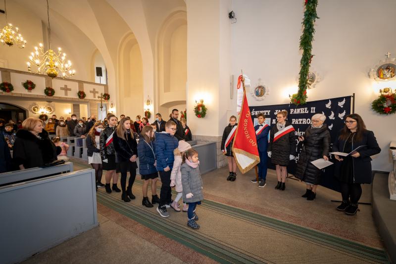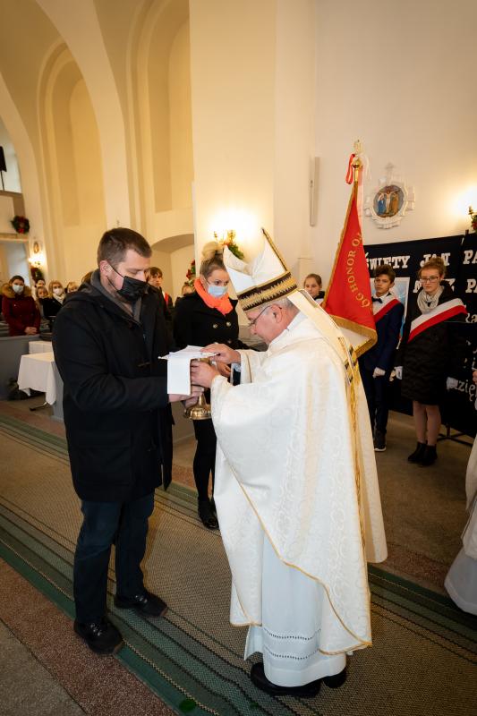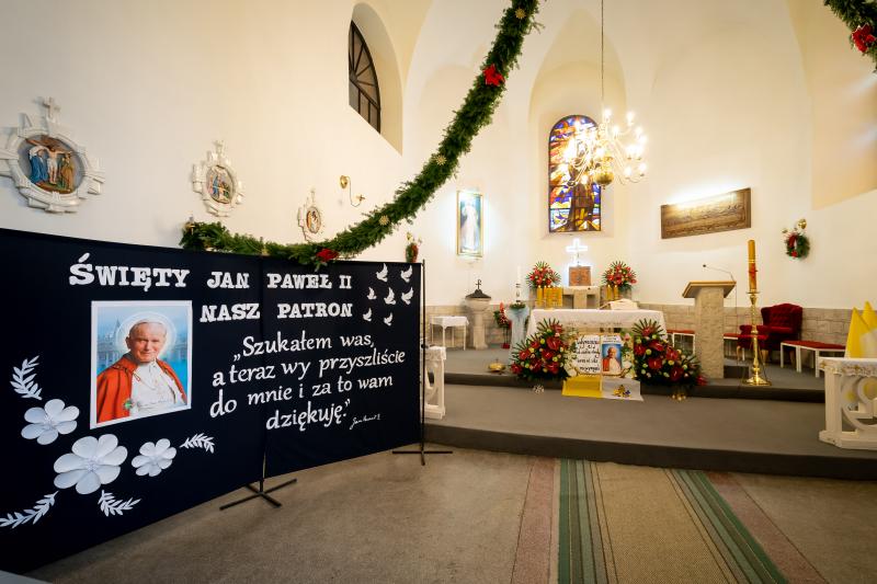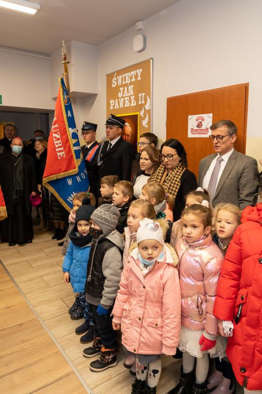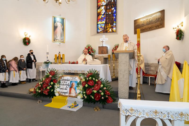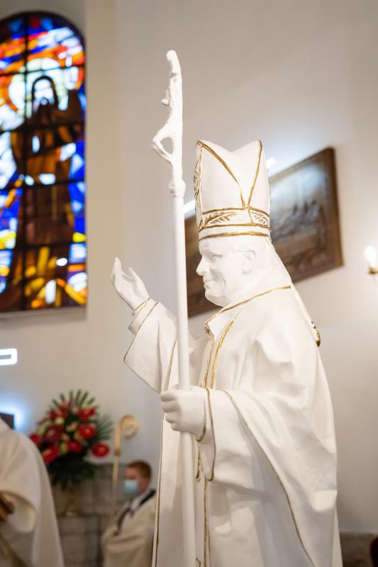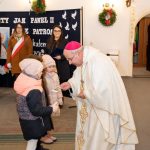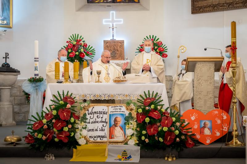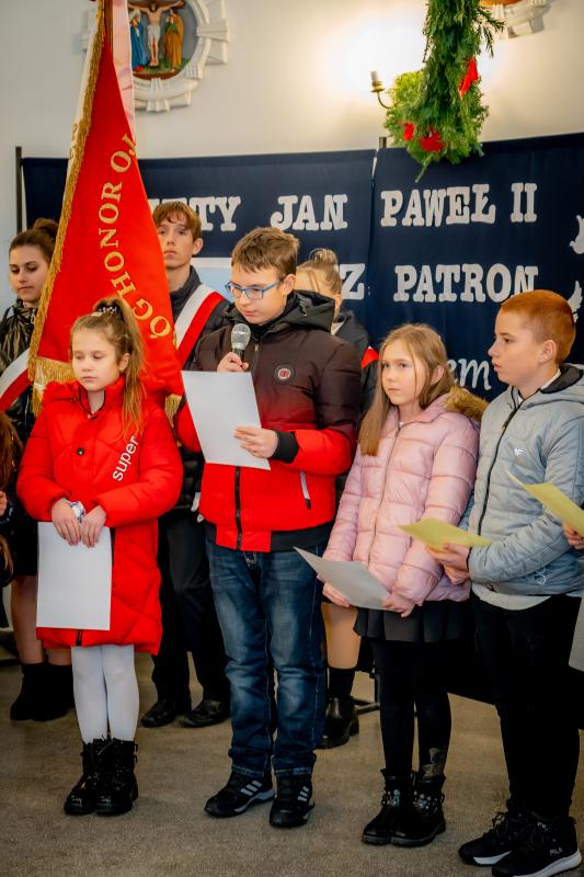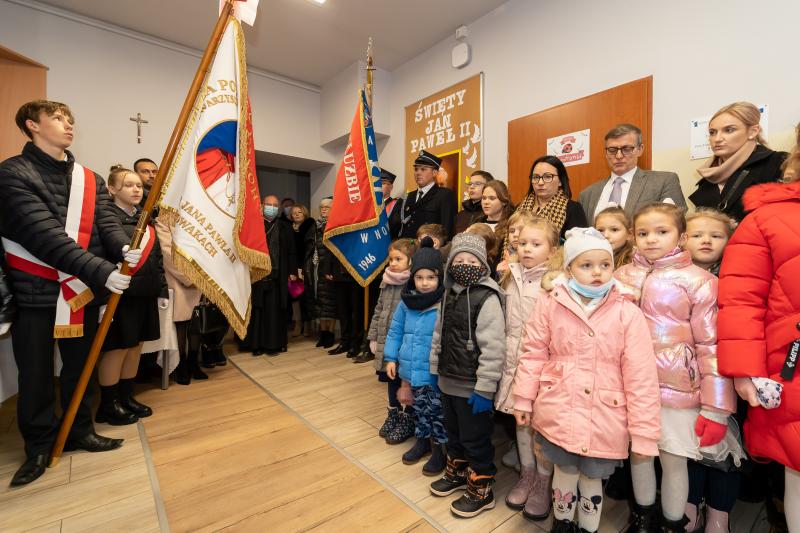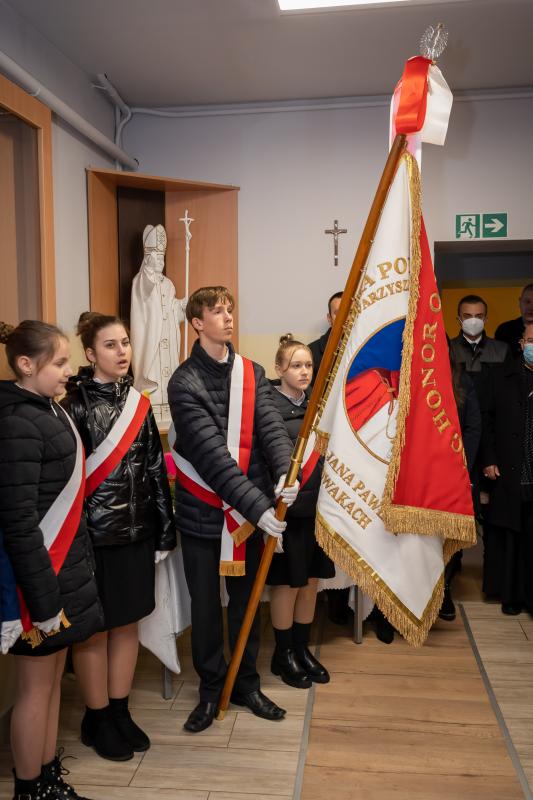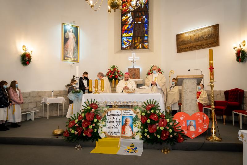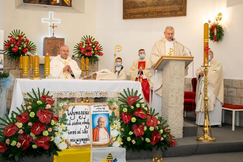 ks. Maciejem Skórą oraz ks. Proboszczem Ryszardem Krawieckim. Uroczysty akt nadania imienia wręczyła Pani Prezes SPSK, Maria Chodkiewicz. W uroczystości brali również udział zaproszeni goście, władze samorządowe, przyjaciele placówki, uczniowie, nauczyciele, pracownicy oraz rodzice. Motywem przewodnim całej uroczystości były słowa papieża: „Wymagajcie od siebie, choćby inni od Was nie wymagali”.