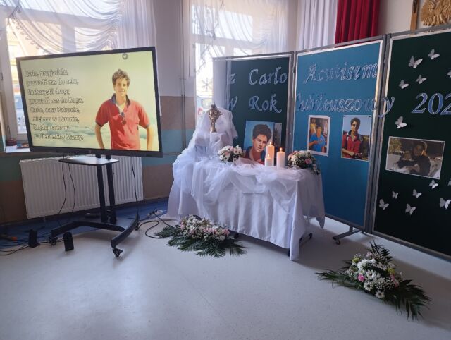 W trakcie uroczystości Pani Vice dyrektor przedstawiła postać Carlo Acutisa, modlono się wspólnie powierzając mu wszelkie intencje. Dzieci z klasy II i III odśpiewały pieśni związane z błogosławionym. Po zakończonym programie modlitewnym każda z klas miała okazję w ciszy czuwać przy relikwiach Błogosławionego Carlo Acutisa.