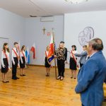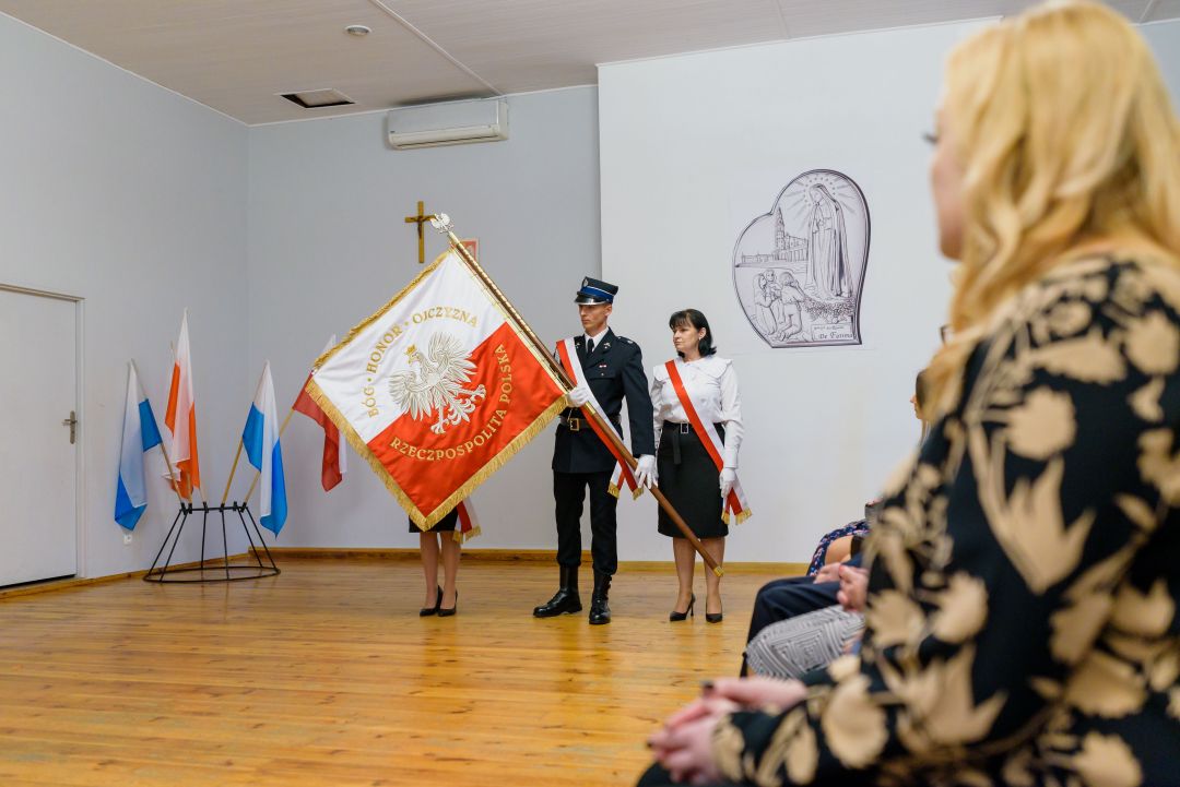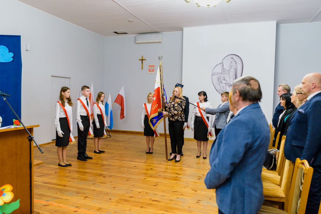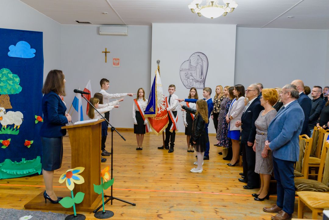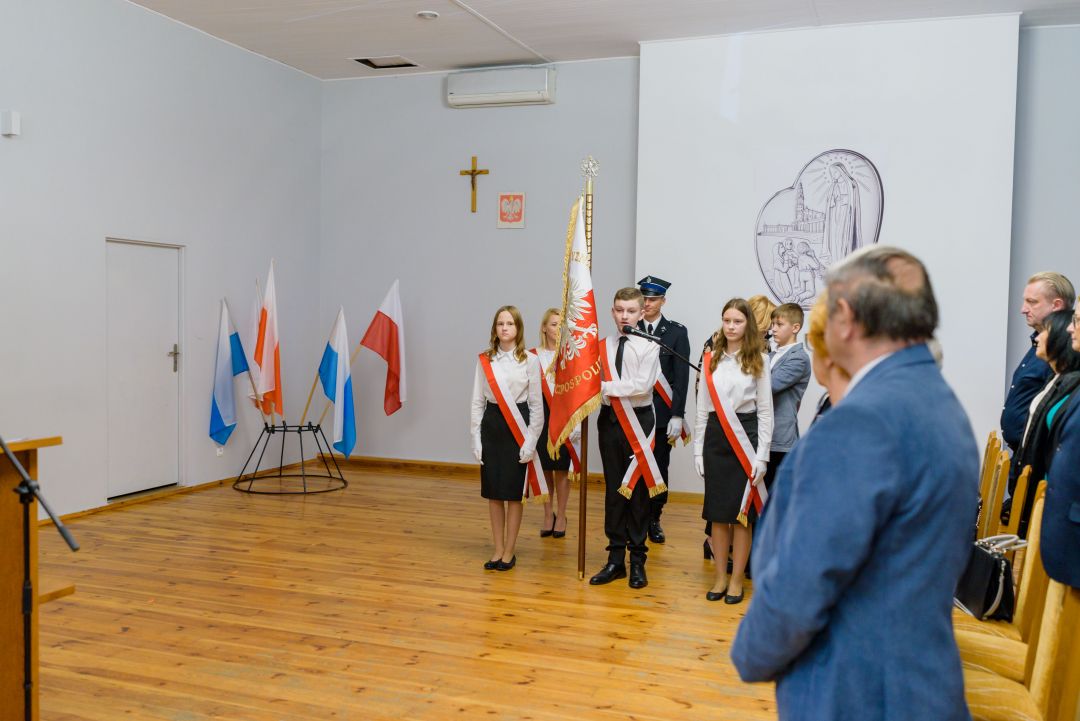 Dalsza część wydarzenia odbyła się w remizie Ochotniczej Straży Pożarnej w Rybnej. Pani Dyrektor – Ewie Golis w swym przemówieniu przypomniała historię szkoły oraz podkreśliła rolę sztandaru zarówno dla społeczności szkolnej, jak i mieszkańców Rybnej. Następnie nastąpiła prezentacja sztandaru przez poczet sztandarowy, w skład którego wchodzili przedstawiciele fundatorów – Pan Patryk Kapitan, Pani Kamila Złoty oraz Pani Dorota Soboniak. Kolejnym punktem uroczystości było przekazanie sztandaru przez Panią Dyrektor uczniom Publicznej Szkoły Podstawowej Stowarzyszenia Przyjaciół Szkół Katolickich im. Św Dzieci z Fatimy w Rybnej, którzy ślubowali oddawać mu cześć i szacunek.
