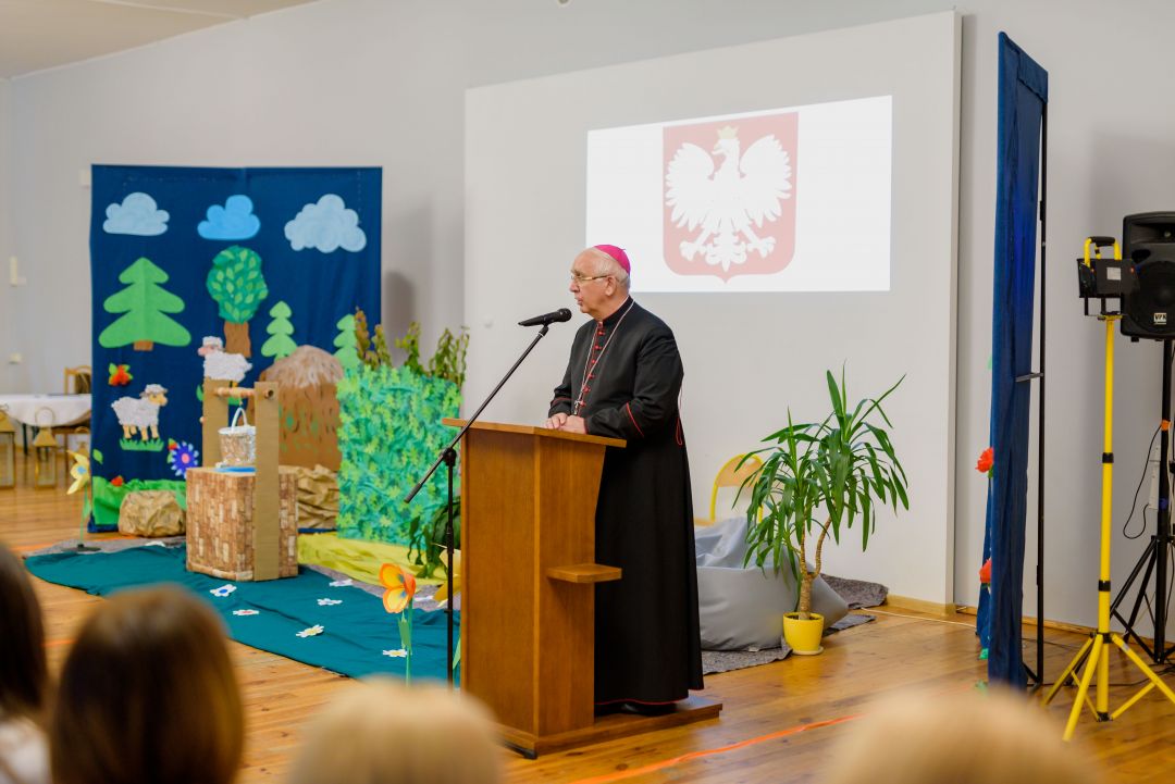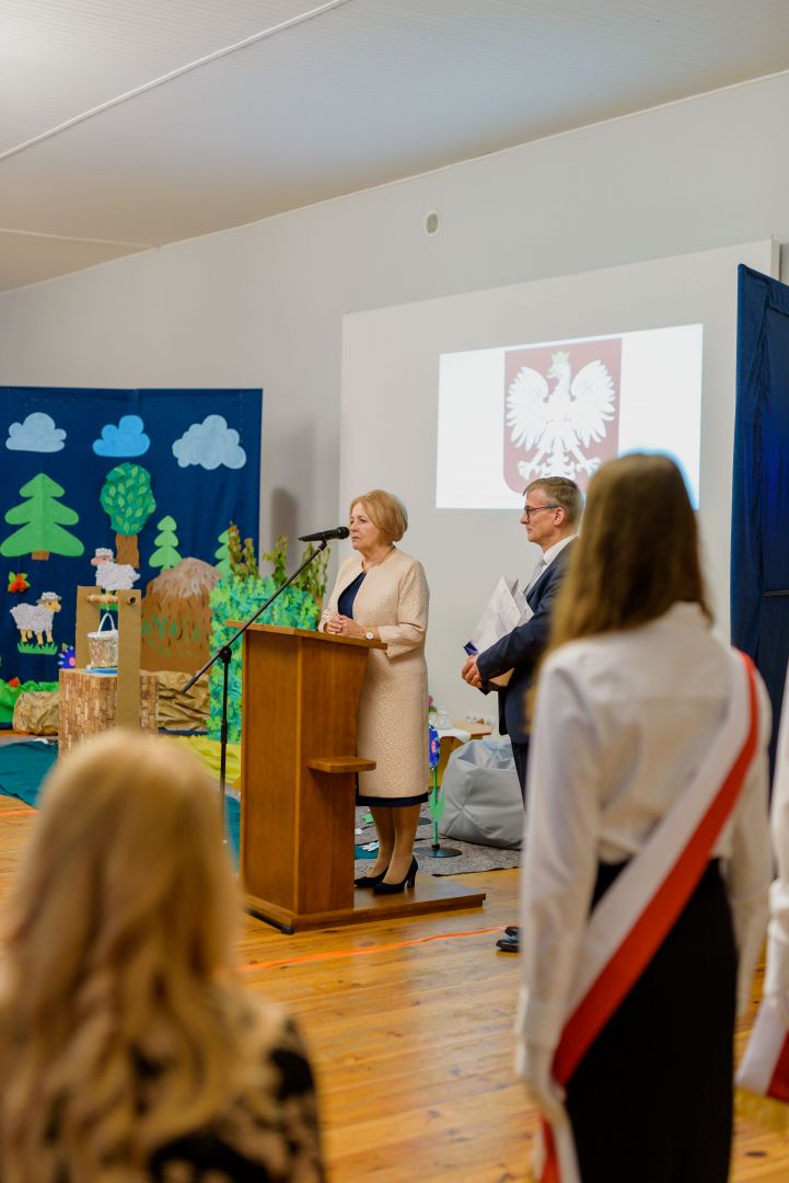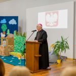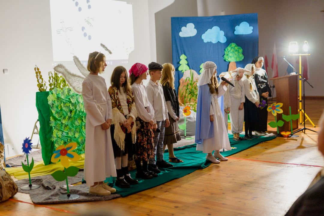Po przekazaniu i wyprowadzeniu sztandaru nastąpiła część artystyczna. Uczniowie z koła teatralnego pod przewodnictwem Pani Doroty Soboniak przygotowali przedstawienie przypominające historię objawień w Fatimie. s