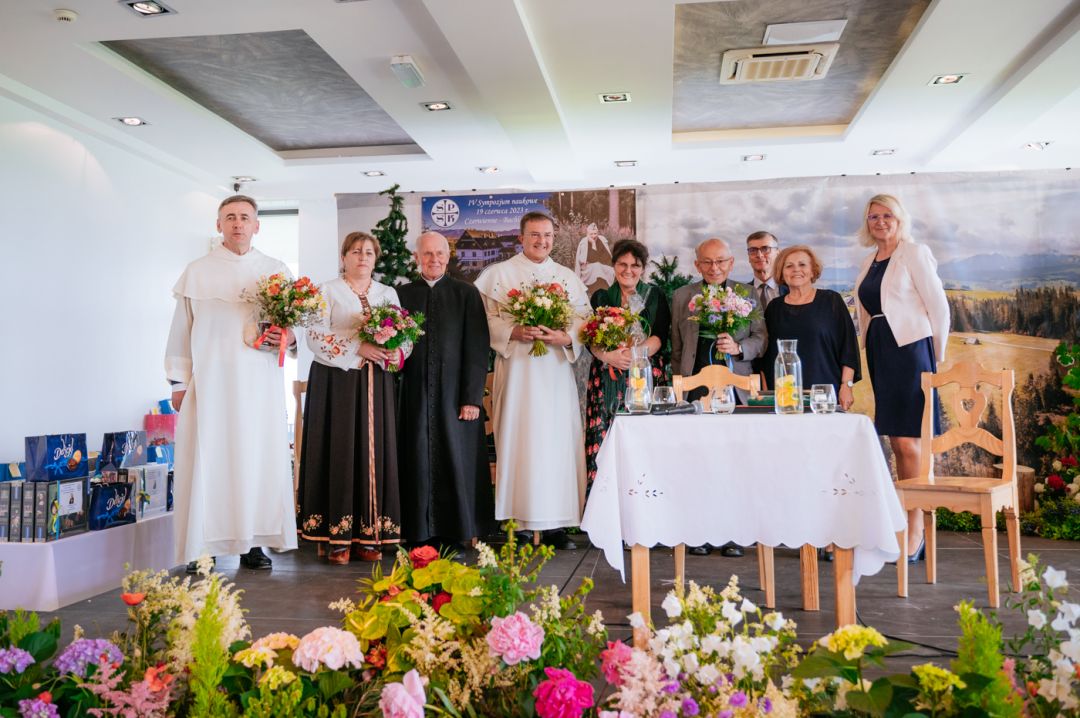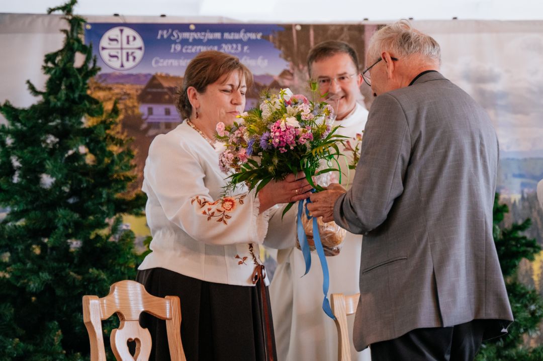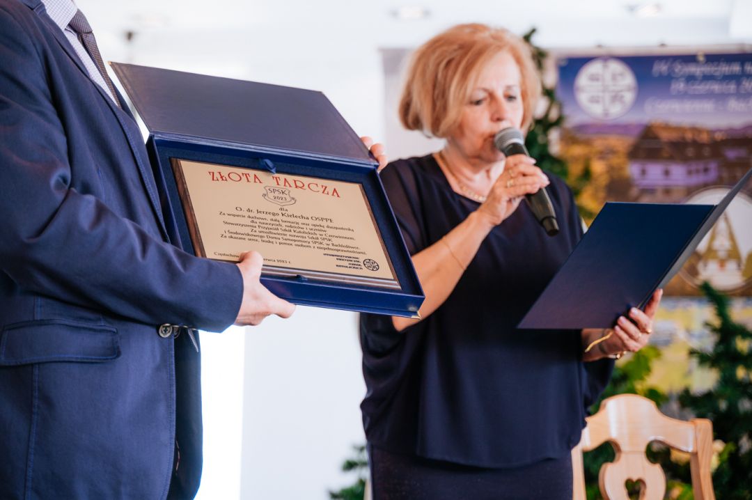 Kolejna część IV Sympozjum Naukowego odbyła się w Hotelu Bachledówka, gdzie Pani Dyrektor Anna Słodyczka powitała wszystkich przybyłych gości, a następnie głos zabrała Prezes SPSK – Pani Maria Chodkiewicz. Pani Prezes przepięknymi słowami podziękowała pani Dyrektor Annie Słodyczce za pracę oraz włożone serce w organizację tak wielu wydarzeń. Ważnym punktem tego wystąpienia na scenie było wręczenie Ojcu Jerzemu Kielechowi najważniejszego odznaczenia przyznawanego przez Zarząd SPSK – „ Złotej Tarczy”.