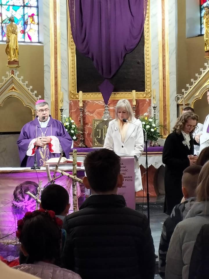 Wraz z biskupem przy ołtarzu stanęli Ks. Tomasz Jackowski – dziekan i proboszcz krośniewickiej parafii oraz Ks. Sławomir Klemba proboszcz parafii w Dzierzbicach. O oprawę liturgiczną Mszy Św. zadbała społeczność szkolna na czele z nauczycielami i rodzicami.