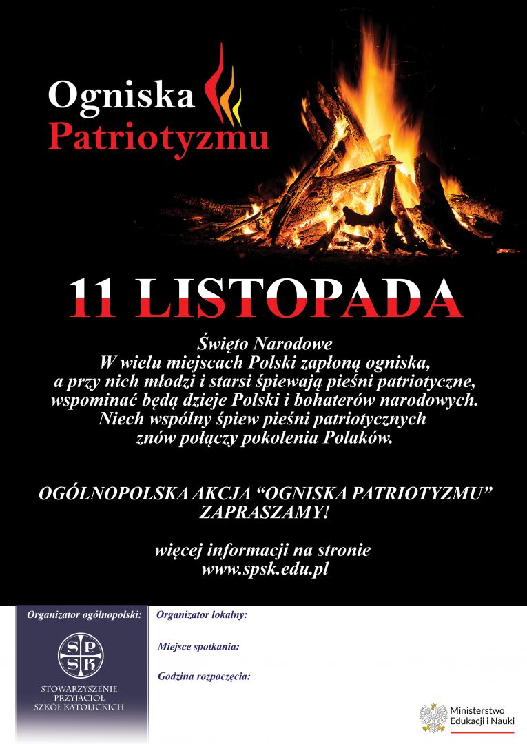 Stowarzyszenie Przyjaciół Szkół Katolickich wygrało realizację projektu patriotycznego „Kocham Ojczyznę bardziej niż własne serce – Patriotyzm na co dzień”, który skierowany jest do uczniów szkół prowadzonych przez SPSK (klas I – VIII) oraz społeczności lokalnej. Projekt zakłada, na wzór poprzednich lat, zorganizowanie w okolicach 11 listopada Ognisk Patriotyzmu. W tym roku Ogniska Patriotyzmu objęte zostały dofinansowaniem ze środków Ministerstwa Edukacji i Nauki, przystąpienie do projektu obejmuje wszystkie szkoły podstawowe Stowarzyszenia.