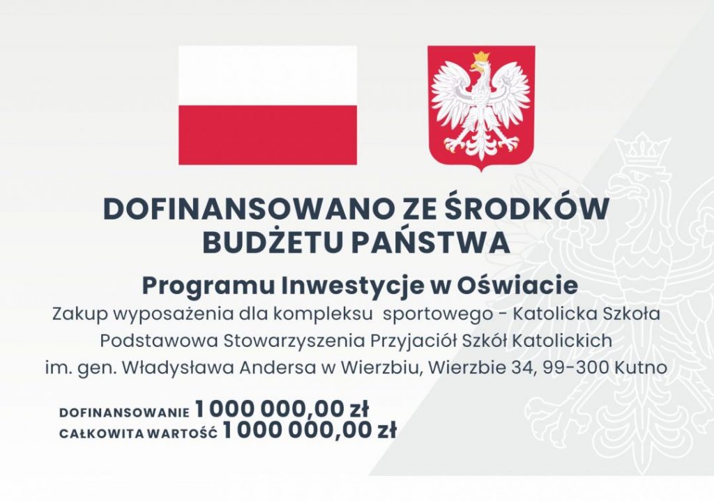 W ramach uzyskanej dotacji ze Skarbu Państwa – Ministra Edukacji i Nauki na wykonanie zadania publicznego z wiązanego z wyposażeniem przedszkoli, szkół lub placówek w zakresie programu INWESTYCJE W OŚWIACIE zostaną zakupione i zamontowane urządzenia związane z wykonaniem boiska wielofunkcyjnego o nawierzchni poliuretanowej do piłki ręcznej, koszykówki i siatkówki wraz z utwardzeniem drogi dojazdowej i placu manewrowego tzn. bramki, stojaki z tablicą do koszykówki, słupki z siatką do siatkówki, piłkochwyt z siatki PP, sprzęt treningowy. Zostaną również zakupione i zamontowane urządzenia do siłowni plenerowej: orbitrek plus rower na pylonie, jeździec plus wioślarz na pylonie, monitoringu, placów zabaw o nawierzchni trawiastej i piaskowej, małej architektury oraz bieżni wraz z zeskocznią do skoku w dal. W zakresie jest również zakup i montaż wyposażenia związanego z boiskiem o nawierzchni trawiastej tj. bramki, piłkochwyty i sprzęt do pielęgnacji murawy.